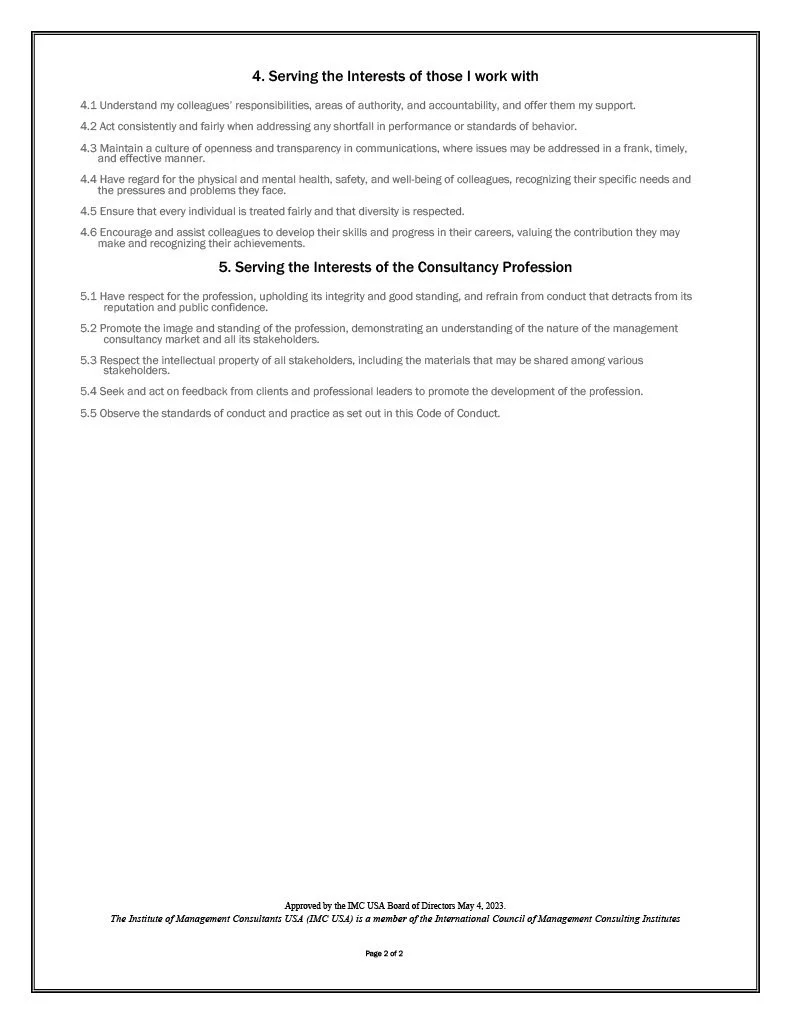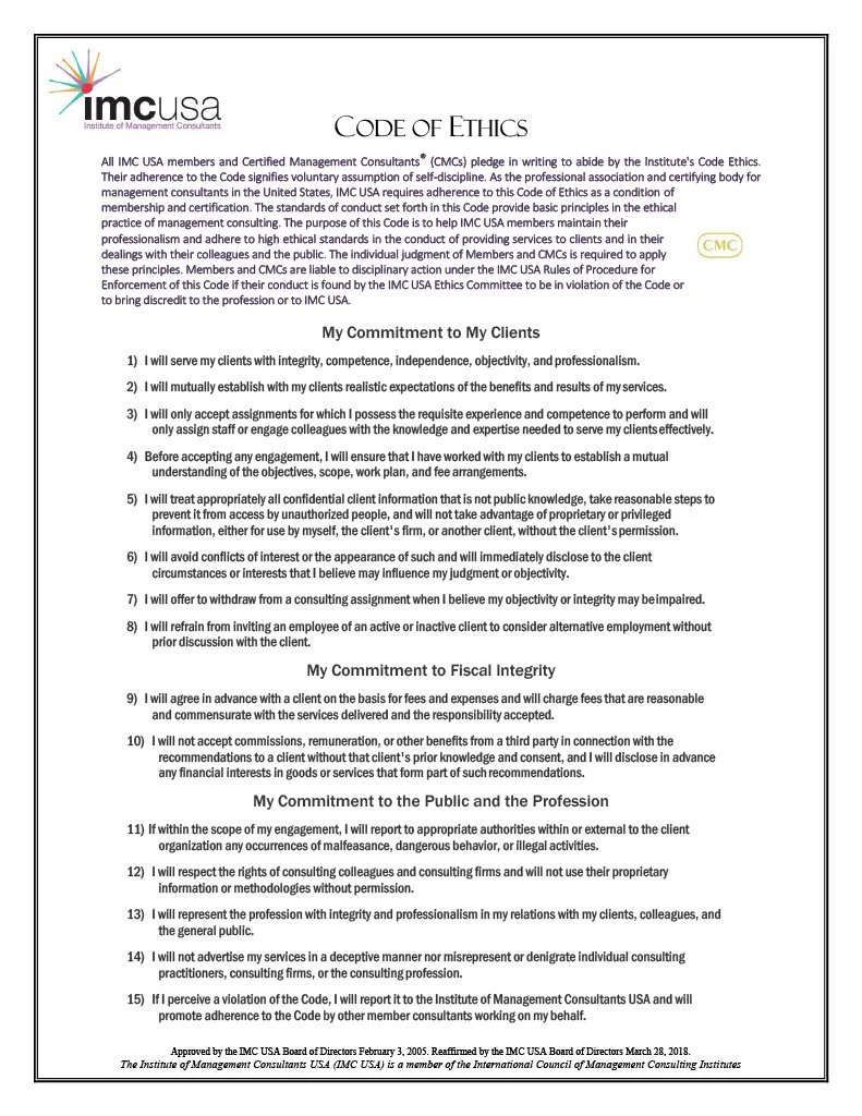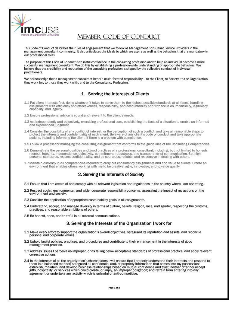 Guiding precepts of an IMC member and Certified Management Consultants™, Code of Ethics and the Member Code of Conduct